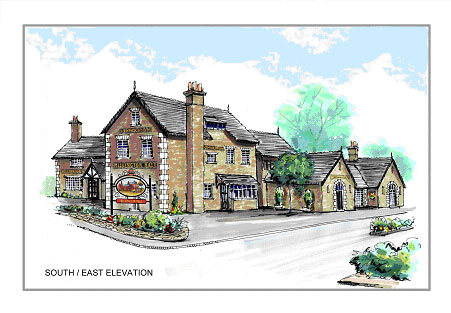 | (3) Millington Hall This brick structured dwelling house was built in 1683 for a local Alderman, John Millington who died in 1694 and is buried at Cheadle. It was later used for hand loom silk weaving and was owned by the Hazeldine's. A thatched outbuilding was converted into three cottages (which once housed Methodist meetings [1814] and are now boutiques). Another, smaller outbuilding is now a florist. Millington Hall is currently a restaurant and meeting place. At its rear is John Hazeldine's wood yard and craft shop which also housed a stables and horses until the mid 1990s. Much of the land to the right (South) of the hall is now occupied by the 4th incarnation of Cheadle Hulme Methodist Church (since 1968). This previously occupied dwelling houses near to Millington Hall (1787), the now Quaker Meeting House Station Road (1824) and the Methodist Church on Bellfield Avenue (1884). The drawings to the right are best viewed on the Methodist Church Website indicated opposite from wher they were obtained. |